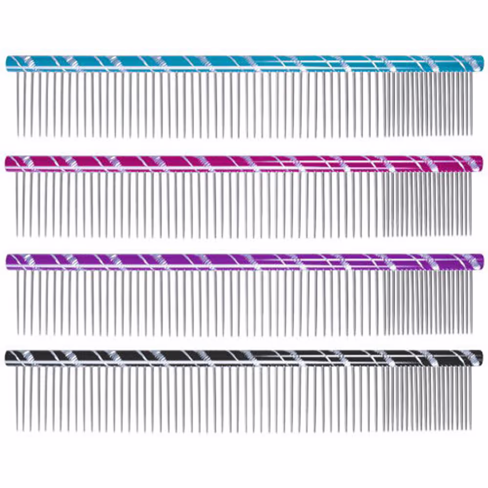 Metalowy grzebień dla psa Chadog o długości 20cm. Zęby osadzone na okrągłym trzpieniu. Długość zębów: 3,4cm. Rozstaw zębów mieszany – średni co 2mm (85%) i gęsty co 1mm (15%). Zęby na końcach zaokrąglone.